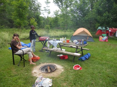 Our site didn’t have too many trees or privacy, but it did have a nice grass covering, a good fire pit, and some shade during the day from the line of trees and bushes on one side of the site.