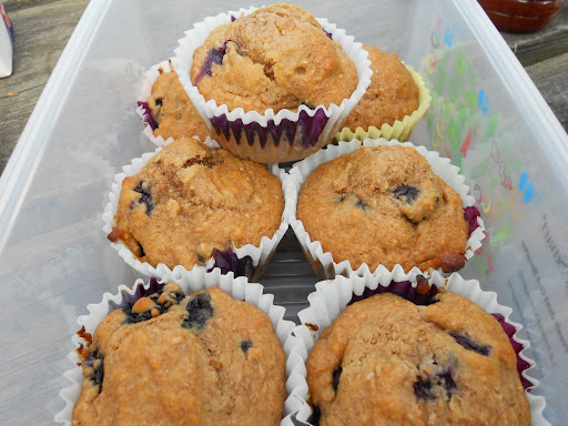 1. I wanted to make these muffins last night, but I didn’t have any blueberries, so I substituted two mashed bananas. Before I put them into the oven I sprinkled a little bit of cinnamon on top. I also used margarin instead of butter.