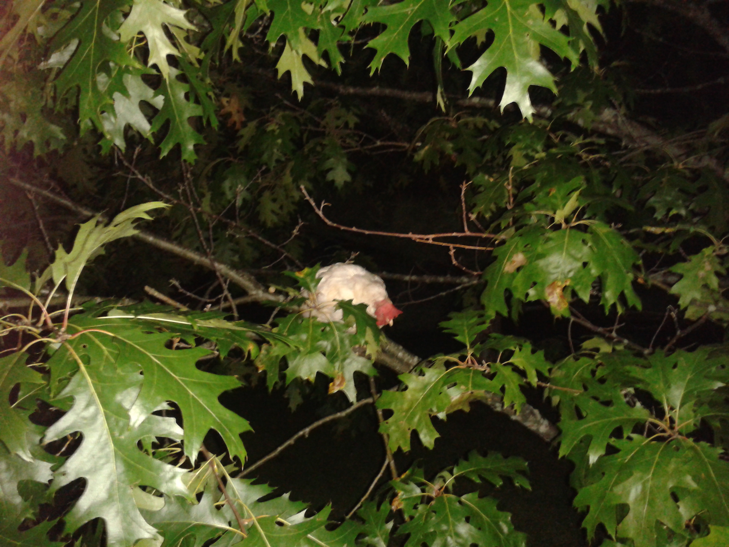 I came home tonight, in the dark, and found no hens in the coop! OH NO! Did an animal get them all, especially since I couldn’t find them anywhere! I was just about to give up looking for them and hope they returned in the morning for food when the light from the flash light went into one of the trees in the front yard. Is that a white blob I see. Hens… are you in the tree? Sure enough on the first set of branches up in the tree there was a hen! Sleeping. Then I looked a little more in the tree and found 3 hens huddling together on a branch. Really hens! Thanks for almost giving me a heart attack and thinking the coyotes got you!
