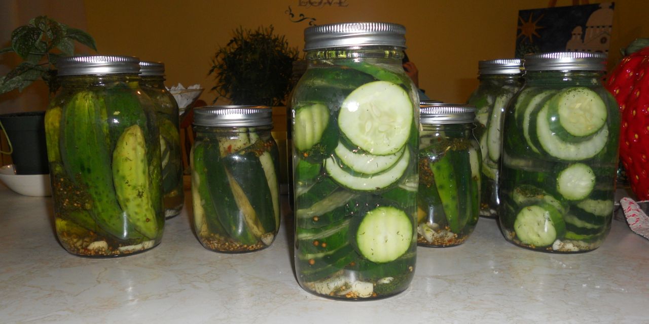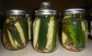 My Mom doesn’t make dill pickles because she says they don’t turn out for her. She makes mustard (my fav homemade pickle) and relish (not a fav… but my Mom knows that). I grew up watching her make pickles. The cutting of the cucumbers, the soaking of the cucumbers in the salt, the smell of onions, the smell of mustard, the cooking, the whole house smelling like onion and mustard, the bottling, listening for the pop of them being sealed, and later the eating of the pickles! Just so you know, the best meal to eat mustard pickles is with potato scollops (scalloped potatoes to my ON friends) and ham. Mmmm… delicious. Well, since my Mom doesn’t make dill pickles and she makes mustard we are going to do an exchange. That’s exciting. I already got some mustard pickles from my sister, so I will have plenty for the winter!