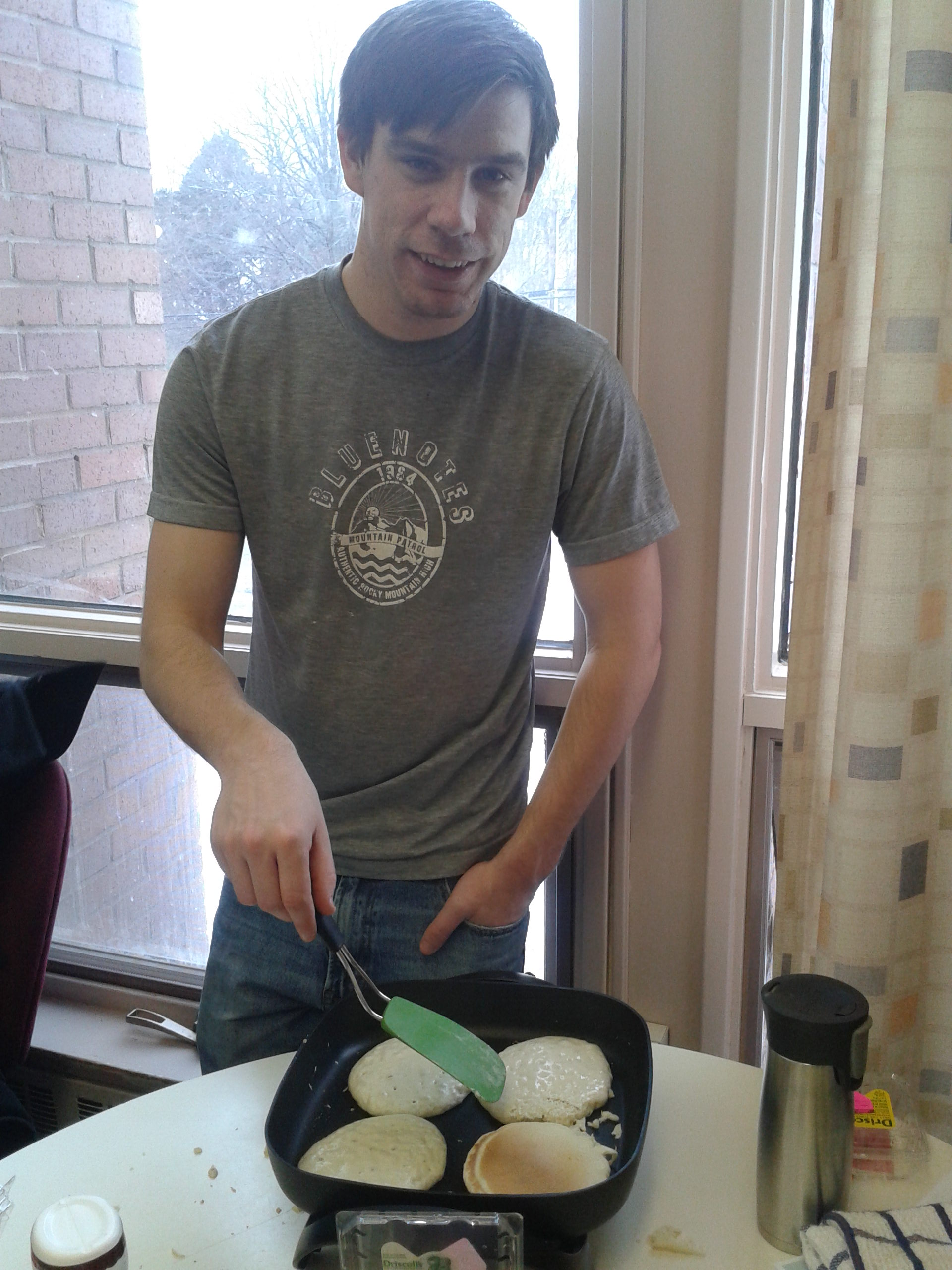 Pancake Tuesday. Shrove Tuesday. Mardi Gras. What ever you call it, it is an excuse to eat pancakes for supper! That’s what it was for me growing up. What kid doesn’t get excited about having breakfast for supper, especially when you only get it once a year. This year I celebrated with fellow friends and classmates at ADC (the place where I’m doing my Masters… which sometimes I still wonder why). The ADCSA (student government) provided us with a lovely pancake lunch including blueberries, raspberries, whip cream, chocolate sauce, chocolate chips, and of course delicious pancakes! Students and staff and faculty (although there were more students than faculty) enjoyed the deliciousness along with some good conversation. The picture shows a few of the pancakes loaded with great toppings and some students enjoying the feast! Dustin is one of 3 cooks.