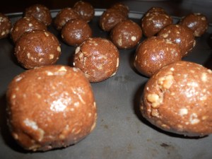 They are called Power Balls because they have lots of protein in them and you shape them into balls.  I guess you could shape them any way you want.  I was thinking about putting them in a pan to make little bars out of them.  I’ll try that next time.  Where does the protein come from?  The peanut butter and powdered milk.  Yes, there is 9g of protein in 1 cup of powdered milk.  My sister looked at the difference between protein powder and powdered milk and she said the powdered milk had just as much protein.